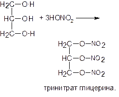 При взаимодействии глицерина с азотной кислотой можно получить соответствующий сложный эфир ‑ тринитрат гицерина: