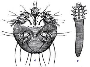 Самка чесоточного клеща напоминает крошечную черепаху. Тело широкоовальное, покрыто треугольными чешуйками, складками, размером 0,3 – 0,4мм.