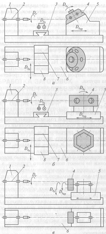 а, б, в — соответственно с наклонной, вертикальной и горизонтальной осями поворота револьверной головки; 7 — передняя бабка; 2 — шпиндель; 3 — поперечный суппорт; 4 — револьверная головка; 5 — револьверный суппорт; 6 — станина; 7,8 — соответственно задний и передний резцедержатели