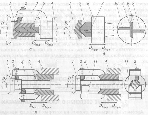 а — резцом и сверлом; б — двумя резцами и люнетной втулкой; в — комбинированным инструментом; г — резцом с применением люнета; 1 — заготовка; 2 — резец; 3 — державка; 4 — револьверная головка; 5 — сверло; 6 — люнетная втулка; 7 — плоское сверло; 8 — оправка; 9, 10 — ножи; 11— люнет (медная призма); DSnpp) DSnpB — соответственно рабочая и вспомогательная продолная подача
