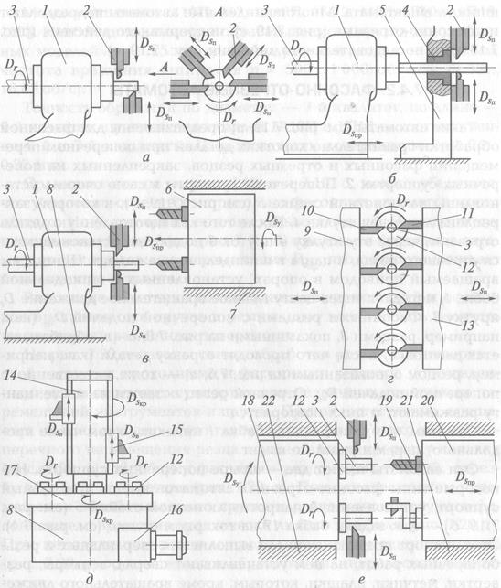 Рис. 7.19. Схемы работы одношпиндельных (з-в) и многошпиндельных (г-е) автоматов:
