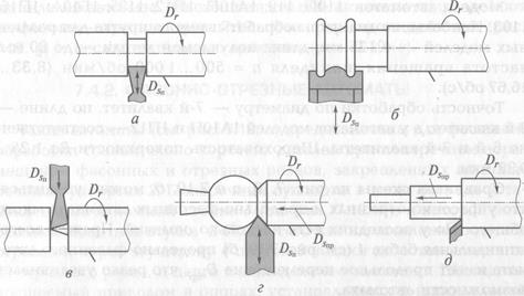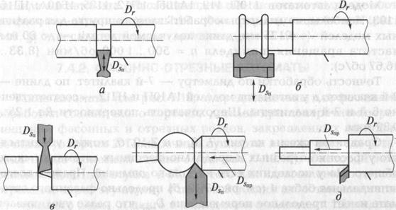 Рис. 7.20. Обработка различных поверхностей заготовок резцами, установленными на поперечных суппортах продольно-фасонных автоматов: а, б, в — соответственно прорезным, фасонным, отрезным (при поперечном перемещении резца без продольного перемещения обрабатываемого прутка); г — обработка фасонной поверхности проходным резцом (при одновременном перемещении прутка и резца); д — обработка цилиндрической поверхности (при неподвижном резце и продольном перемещении прутка)