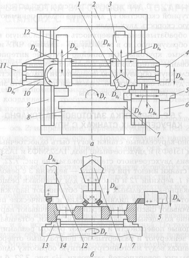 7 — револьверная головка; 2 — поперечина; 3 — револьверный суппорт; 4, 6, 11 — коробки подач; 5 — боковой суппорт; 7 — карусель; 8 — станина; 9 — стойки; 10 — подвижная траверса; 12 — верхний суппорт; 13 — приспособление; 14 — заготовка