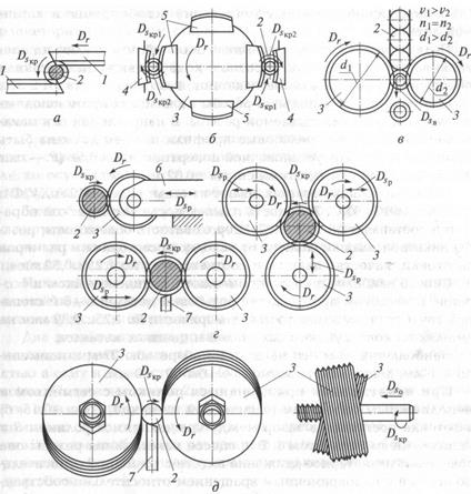 а - плоскими плашками; б - вращающимся роликом с сегментными плашками и неподвижными сегментными плашками; в - двумя роликами разных диаметров; г - роликами с их радиальной подачей; д - роликами (оси которых параллельны или скрещиваются) с осевой подачей заготовки; 1 - плоские плашки; 2 - заготовка; 3 - ролики; 4, 5 - неподвижные и вращающиеся сегментные плашки соответственно; 6 - державка; 7 - стойка; v1, v2 - окружные скорости; n1, n2 - частоты вращения; d1, d2 - диаметры роликов