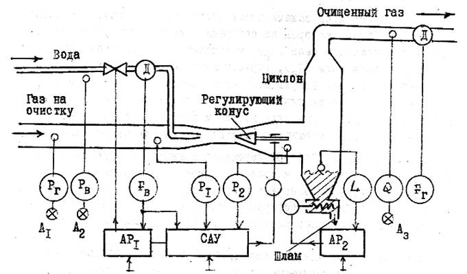 Рис. 6.3.Типовая схема автоматизации мокрой очистки газов: 1 – корпус трубы Вентури; 2 – форсунки; 3-регулируемая горловина