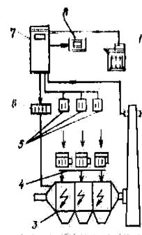 Рис.6.6.Стуктурная схема МП – системы управления фирмы «Лурги»: 1-печатающее устройство; 2-измеритель оптической плотности; 3-электрофильтр; 4-агрегаты питания; 5-контрольное устройство; 6-программатор; 7-миниЭВМ; 8-дисплей