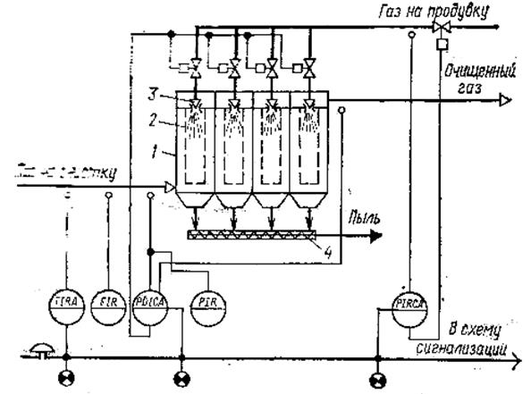 Рис.6.9.Типовая схема автоматизации процесса фильтрования газовых систем: 1-корпус фильтра; 2-рукава; 3-сопла импульсной продувки; 4-шнек