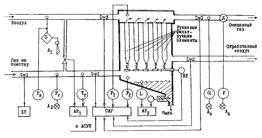 Логическая система автоматического управления (САУ) реализует заданный алгоритм последовательного выполнения отдельных операций при регенерации фильтра (управление отсечными клапанами, включение вибратора (ВБ), согласование работы газоочистной установки с другими агрегатами и другое).