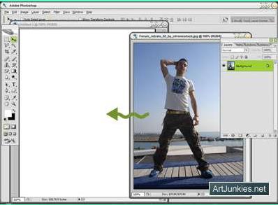 Тяните инструментом use Move tool (Перемещение) (V) вашу фотографию на новый документ: