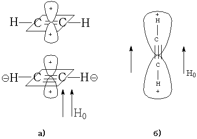 Для ацетилена в зависимости от расположения молекулы по отношению к направлению Н0 может быть как дезэкранирование –а), так и диамагнитное экранирование –б). Поэтому протоны при тройной связи резонируют в более сильном поле, чем при двойной.