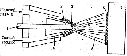 Для расплавления распыляемого материала используется теплота, выделяющаяся при сжигании смеси: (горючий газ + кислород) в газопламенной горелке.
