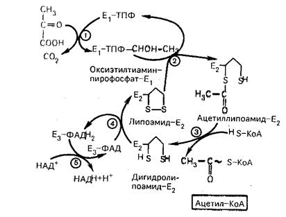 На I стадии этого процесса пируват теряет свою карбоксильную группу в результате взаимодействия с тиаминпирофосфатом (ТПФ) в составе активного центра фермента пируватдегидрогеназы (Е1). На II второй стадии оксиэтильная группа комплекса Е1-ТПФ-СНОН-СН3 окисляется с образованием ацетильной группы, которая одновременно переносится на амид липоевой кислоты (кофермент), связанной с ферментом дигидролипоилацетилтрансферазой (Е2). Этот фермент катализирует III стадию – перенос ацетильной группы на коэнзим КоА (HS-КоА) с образованием конечного продукта ацетил-КоА, который является высокоэнергетическим (макроэргическим) соединением.