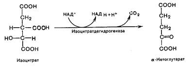 В ходе изоцитратдегидрогеназной реакции изолимонная кислота одновременно декарбоксилируется. НАД-зависимая изоцитратдегидрогеназа является аллостерическим ферментом, которому в качестве специфического активатора необходим АДФ и для проявления своей активности фермент нуждается в Mg2+ и Mn2+.