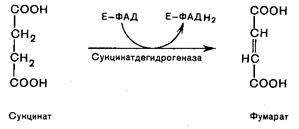 В результате шестой реакции сукцинат дегидрируется в фумаровую кислоту. Окисление сукцината катализируется сукцинатдегидрогеназой, в молекуле которой с белком прочно (ковалентно) связан кофермент ФАД. В свою очередь, сукцинатдегидрогеназа прочно связана с внутренней митохондриальной мембраной: