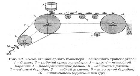 У МНПД грузонесущие органы перемещают груз непрерывным или почти непрерывным потоком, т.е. они не останавливаются для захвата груза.Для примера рассмотрим схему конвейера - ленточного транспортёра (рис. 1.2).