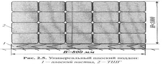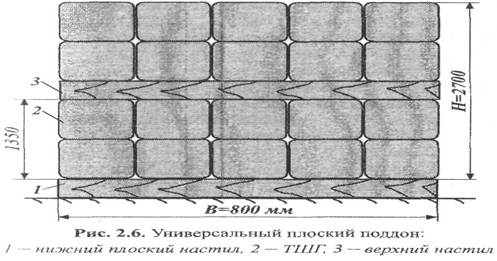 Кроме того, имеются универсальные плоские поддоны од но настильные и двухзаходные. Конструктивно эти поддоны представляют собой плоский настил из дерева, по краям которого гвоздями прикреплены два бруска (рис. 2.4). Здесь высота груза достигает до 1800 мм.