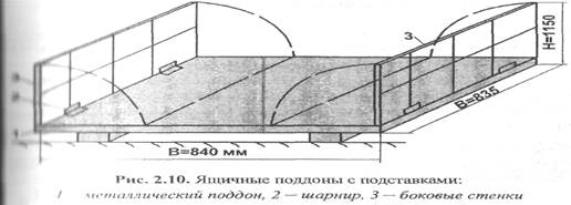 Ящичные поддоны (рис. 2.10) изготавливаются из металла и опираются на подставки высотой не более 100 мм. Они снабжены шарнирно соединёнными боковыми стенками, которые предохраняют размещаемый на поддон груз от обвалов и перемещения. Стенки бывают решётчатой и сетчатой формы. Они могут быть изготовлены из дерева. При возврате стенки укладываются на лоддон, одна на другую. Размеры и грузоподъёмность ящичних поддонов такие же, как у рассмотрен-