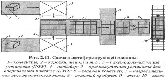 Коробки мешки и т.д. (2), из которых потребуется формировать пакет, перемещается по конвейеру (1)+ на пакетоформирующую установку (ПФУ -3). Готовый пакет по конвейеру (4) поступает на промежуточную установку (5) для обёртывания . После обертывания пакет через главный конвейер (6), который совершает непрерывное или шаговое движение, поступает на нагревательную печь туннельного типа (7). Затем готовый продукт (8) до стола (9) и от него до вагона (10) перемещается ЭП или АП с нейтрализацией выхлопных газов.