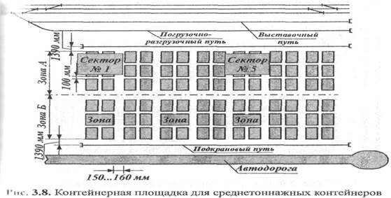 Универсальные контейнеры перерабатываются на контейнерных пунктах и на контейнерных площадках.Схема контейнерной площадки для среднетоннажных контейнеров показана на рис. 3.7.
