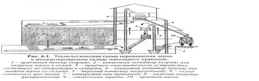 Зерно, поступающее из транспортного средства в приёмные бункера (лари) 1, поднимается ковшовым элеватором (норией) 2 на приёмно - очистительные устройства 3. После этого зерно ковшовым элеватором 4 подаётся на верхний загрузочный конвейер 5 для заполнения склада 6, где оно хранится.