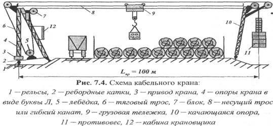 Кран кабельный может быть передвижным и стационарным (рис. 7.4). Например, передвижной кран КК-20 длиной пролёта 100 м и грузоподъёмностью 20 тс. Конструктивно правая качающаяся опора 10 соединена с левой опорой 4 посредством несущего гибкого каната 8. Этот канат перекинут через неподвижный блок, закреплённый в опоре 10, и