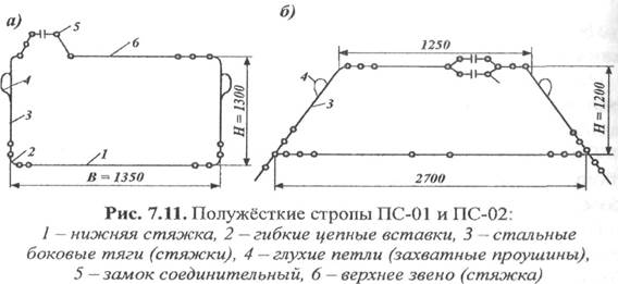 Полужёсткие стропы имеют стальные боковые тяги 3. Верхние глухие петли 4 на концах тяг играют роль захватных проушин, а за нижние закреплено несущее звено из гибких цепных вставок 2 и нижней стяжки 1. Соединительное верхнее звено 6 также изготовлено из цепи и стали круглого профиля. Его крепят к захватным проушинам. С помощью замка 5 и закрутки пакет закрепляется в стропах. Грузоподъёмность ПС-01,..., ПС-03 - 3 тс. Диаметр прутка Ø16 мм.