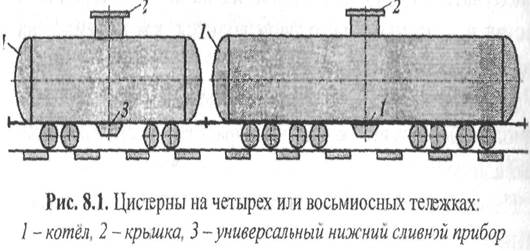 Рис. 8.1. Цистерны на четырех или восьммосных тележках: