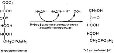 Во второй – окислительной реакции, катализируемой 6-фосфоглюконатдегидрогеназой (декарбоксилирующей), 6-фосфоглюконат дегидрируется и декарбоксилируется. В результате образуется фосфорилированная кетопентоза – D-рибулозо-5-фосфат и еще 1 молекула НАДФН: