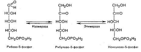 Под действием соответствующей эпимеразы из рибулозо-5фосфата может образовываться другая фосфопентоза – ксилозо-5-фосфат. Кроме того, рибулозо-5-фосфат под влиянием особой изомеразы легко превращается в рибозо-5-фосфат. Между этими формам пентозофосфатов устанавливается состояние подвижного равновесия: