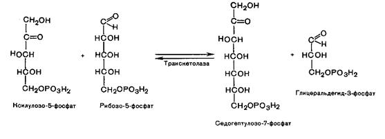 Коферментом в транскетолазной реакции служит ТПФ (тиаминпирофосфат), играющий роль промежуточного переносчика гликольальдегидной группы от ксилулозо-5-фосфата к рибозо-5-фосфату. В результате образуется семиуглеродный моносахарид седогептулозо-7-фосфат и глицеральдегид-3-фосфат.