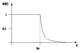 До уровня Ферми все уровни заполнены, а после уровня Ферми вероятность заполнения стремиться к 0. Чем выше температура, тем более размытой граница становится, а в близи абсолютного нуля это будет почти ступень. Распределение Ферми подходит для описания статистики электронов в любом твердом теле.