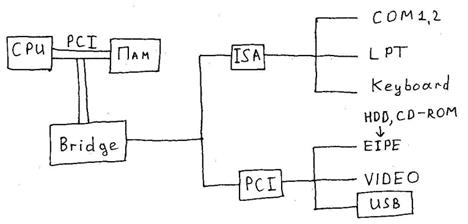 Внешние устройства: видеокарта, медленные устройства (принтер, …) (подключаются через LРT порт, которые в том или ином виде оперирует с шиной ISA или что-то другое), Floppy Disc, Hard Disc, CD-ROM. Есть шина EIDE, к которой подключают Hard Driver и CD-ROM. Еще есть шина USB. Клавиатура подключена к ISA. Есть COM порты, LPT порт.