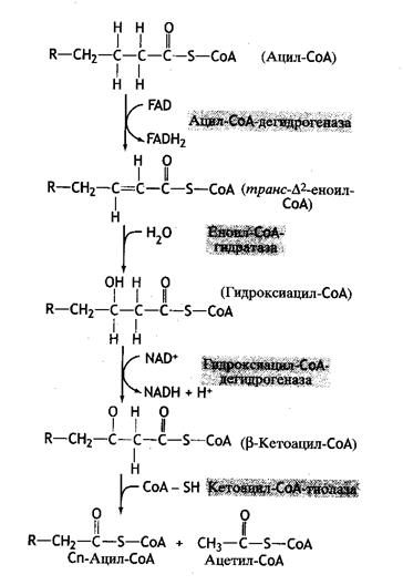 Первой реакцией в каждом цикле распада ацил-КоА является его окисление ацил-КоА-дегидрогеназой, приводящее к образованию еноил-КоА с двойной связью между С-2 и С-3. Енол-КоА при участии фермента енол-КоА-гидратазы присоединяет молекулу воды. В результате образуется b-оксиацил-КоА (или 3-гидроксиацил-КоА), который затем дегидрируется и превращается в b-кетоацил-КоА (3-оксиацил-КоА).