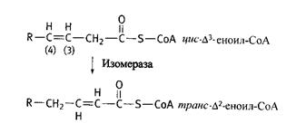 Окисление ненасыщенных жирных кислот идет через дополнительные стадии, включающие перемещение двойной связи в углеводородной цепи жирной кислоты и перевод этой связи в транс-форму с помощью фермента изомеразы.