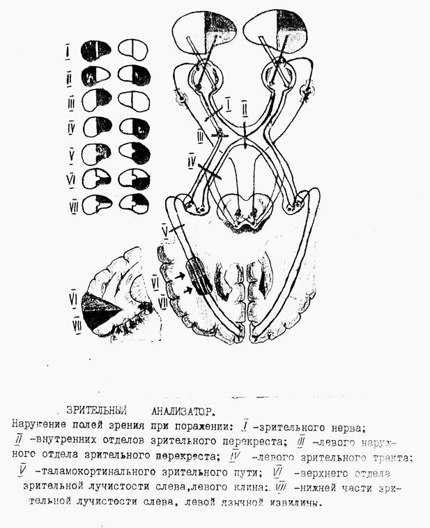 После перекреста в каждом зрительном тракте содержатся нервные волокна, идущие от внутренней (носовой) половины сетчатки противоположного глаза и от наружной (височной) половины сетчатки глаза одноименной стороны. При повреждении зрительного тракта после перекреста развивается своеобразная форма слепоты, или гемианопсия – половинная слепота. При таком одностороннем повреждении зрительного тракта выпадают одинаковые (правые или левые) стороны полей зрения на обоих глазах, такая гемианопсия носит название гомонимной. Гетеронимная гемианопсия характеризуется выпадением или внутренних полей зрения (двустороння носовая гемианопсия) или наружных (двустороння височная гемианопсия), что наблюдается, например, при поражении зрительных путей в области самого перекреста.