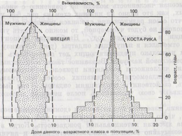 Кривая выживания для человека представляет сильно выпуклую кривую. Поскольку средняя продолжительность жизни женщин практически во всех человеческих популяциях выше, чем мужчин, кривая выживания для женщин несколько сдвинута вверх и вправо от аналогичной кривой для мужчин.