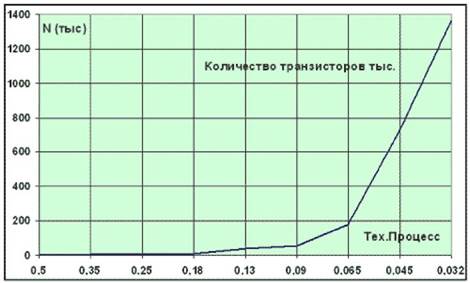 4. Уменьшение площади занимаемой транзистором. Размещение большего число транзисторов и усложнение структуры процессора на подложке, размер которо не превышает подложку предыдуще серии процессоров. Это свойство используют разработчики процессоров. Количество транзисторов на чипе постоянно растет.