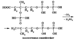 Нестабильная молекула 3-фосфо-5-пирофосфомевалоновой кислоты декарбоксилируется и дефосфорилируется, формируя непредельное соединение – изопентенил-пирофосфат (С5):