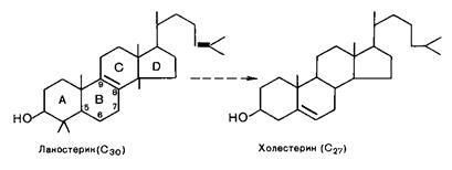 На заключительной стадии следует циклизация сквалена при участии НАДФН+ + Н+, молекулярного кислорода и сквален-синтетазы с образованием ланостерина (С30), который уже имеет стероидную циклическую структуру. Ланостерин под влиянием ряда ферментов теряет три метильные группы и трансформируется в холестерол: