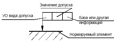 Рис.32. Схема обозначения допусков формы и расположения на чертежах: а – общая схема; б - обозначение нормируемого элемента с помощью выносной линии