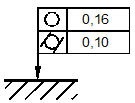 На рис.37, а обозначен допуск радиального биения, заданный относительно двух баз А и Б. Совместное обозначение двух одинаковых по значению допусков радиального и торцового биений относительно одной базы представлено на рис.37, б.