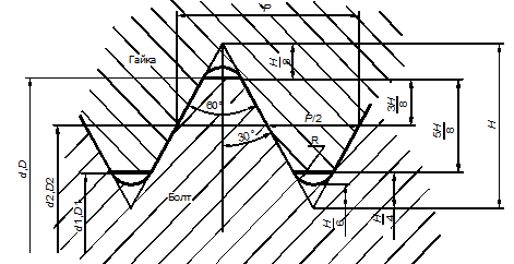 d, D– наружный диаметр болта и гайки соответственно. Он принимается за номинальный диаметр резьбы;