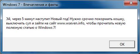 Очень удобная вещь, когда нужно напомнить себе о том, что через 5 минут наступит Новый год, что пора покормить кошку, выключить суп или зайти на сайт Windows 7 – Впечатления и факты. Выглядеть такое сообщение будет примерно так: