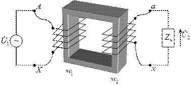 На замкнутом стальном сердечнике (магнитопроводе) расположены две обмотки. Только для наглядности обмотки показаны на различных стержнях магнитопровода. На самом деле они размещаются концентрически, одна поверх другой на обоих стержнях магнитопровода. Обмотки выполнены из медного провода, и электрически не связаны между собой. Между ними существует только магнитная связь, а магнитопровод служит для усиления этой связи.
