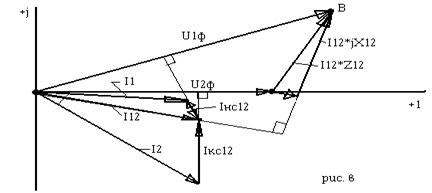 опережает на 90о напряжение U2ф. Ток I12 соединяет начало первого и конец второго суммируеммых векторов в правой части урав.(2) [I12=I2+