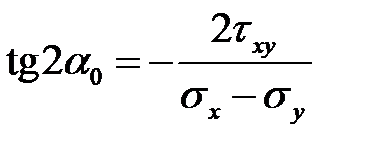 Исключив из этих формул s1 и s2, получим формулу для определения угла наклона главных площадок относительно заданной площадки. Обозначим этот угол a0. Так как направление отсчета углов a для площадки произвольного положения и угла a0 противоположны, то в полученной формуле необходимо изменить знак. Положительный угол a0 будем откладывать от направления внешней нормали к площадке, по которой действуют большие нормальные напряжения sх против хода часовой стрелки: