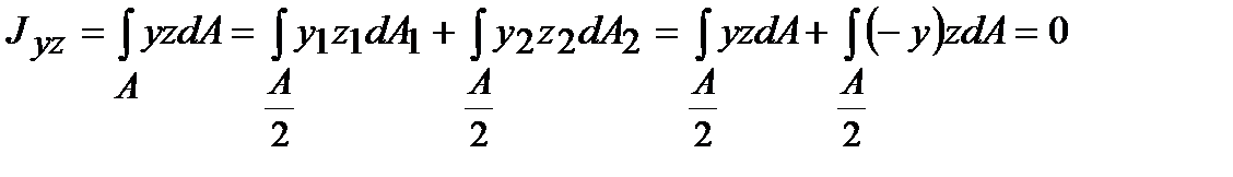 Центробежный момент инерции сечения относительно осей, хотя бы одна из которых является осью симметрии, равен нулю. Действительно для симметричной фигуры всегда можно выделить два элемента ее площади (рис. 4.2), которые имеют одинаковые ординаты у1=у2=у, и равные по величине, но противоположные по знаку абсциссы z1=z и z2=–z. Тогда
