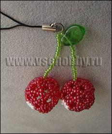 4. Теперь делаем так же как и вшивали две красных и одну серебряную бусины, только вместо двух красных бусинок вшиваем два красных стекляруса.