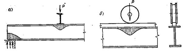 К местным напряжениям, возникающим из-за внешних воздействий, относятся напряжения в местах приложения сосредоточенных нагрузок - на опорах, в местах опирания каких-либо других конструкций (рис. а),под катками мостовых кранов в подкрановых балках (рис. б), в местах крепления вспомогательных элементов. Местные напряжения могут привести к развитию чрезмерных пластических деформаций, трещин или к потере устойчивости в тонких элементах сечений (например, стенки двутавра).
