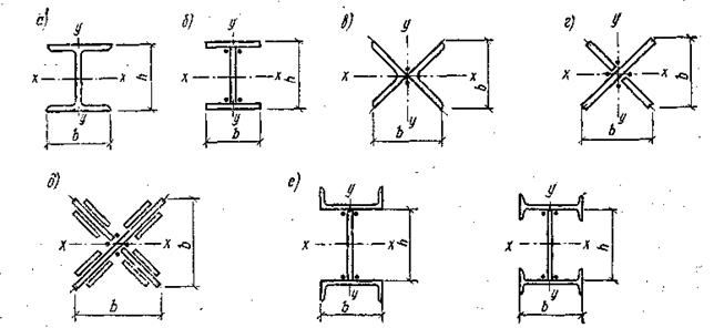 У прокатного широкополочного двутавра (рис. а) может быть b = h, что не удовлетворяет условию равноустойчивости, но все же дает сечение, вполне пригодное для колонн.